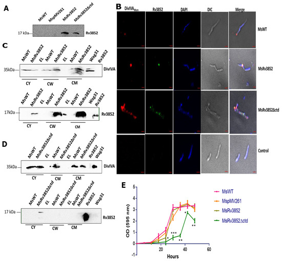 3.6. Ectopic Expression of Rv3852 in M. smegmatis Leads to More DivIVAMsm Deposition in Cell Wall