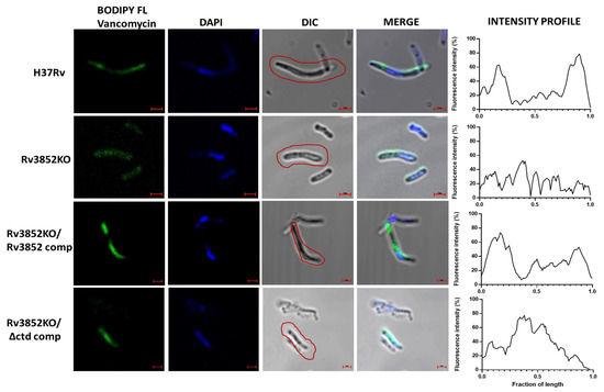 The pattern of nascent peptidoglycan synthesis was visualized in Mtb and M. smegmatis strains by using a protocol published earlier [37]. The Mtb strains were grown until 0.4 OD, and 1 mL culture was incubated with 1 µg mL−1 BODIPY FL Vancomycin (Thermo Fisher Scientific, Waltham, MA, USA) and grown for 16 h. The cells were harvested, washed with 1X PBS, fixed with 4% PFA and stained with 10 µg mL−1 DAPI (Sigma-Aldrich, Saint Louis, MO, USA) for 30 min, mounted with prolong glass antifade (Thermo Fisher Scientific, Waltham, MA, USA), and visualized under 100X objective with 2X zoom using Zeiss LSM-880 microscope. The images were processed with Zen blue 2.3 lite software, and the percent fluorescence intensity along the length of the bacteria was plotted as described above. The same protocol was followed for staining M. smegmatis strains, except the time of staining was 3 h.