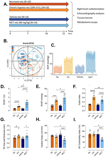 Characterization of pulmonary hypertension by echocardiography and right heart catheterization of CH-PH and MCT-PH rats and their respective controls. (A). Experimental protocol. Preparation and analysis of CH-PH rats, MCT-PH rats, Normoxia rats (as control for CH-PH rats), and Vehicle rats (as controls for MCT-PH). (B). Principal Component Analysis (PCA) projection from all echocardiography and catheterization parameters. (C). Representation of the record of right ventricular pressure (RVP) expressed in mmHg. (D–I). Bar graph of top-six altered parameters in normoxia (Nx), chronic hypoxia (CH), vehicle and monocrotaline (MCT) rats: (D). Right ventricular systolic pressure (RVS.P). (E). Pulmonary vascular resistance (PVR, evaluated by RVS.P/Cardiac output ratio). (F). RV hypertrophy by measuring the Fulton index. (G). RV free wall thickness index. (H). Cardiac output. (I). RV contractility index. t-tests were used after verification of normal distribution of values (Shapiro–Wilk normality test). p-values are shown in Supplementary Table S1. Significance: * p ≤ 0.05; ** p ≤ 0.01; *** p ≤ 0.001, **** p ≤ 0.0001.