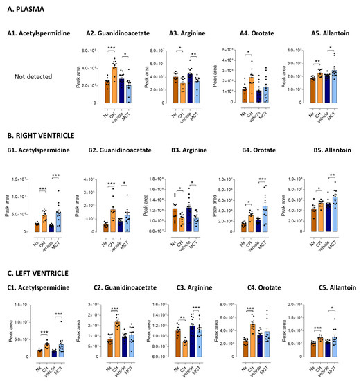 Alteration of polyamines (i.e., spermidine, acetyl-spermidine, and putrescine) was only observed in LV and RV tissues with p-values < 0.01, and fold changes were among the most important FC observed in the current study (Table 2). Particularly, acetyl-spermidine was found to be elevated more than twice in the heart of PH-models (Figure 3(B1,C1)). In addition, arginine and guanidinoacetate were altered in plasma and heart (LV and RV from both CH and MCT rats). Guanidinoacetate was the most altered metabolite of the arginine metabolic pathway with FC > 3 and p < 0.0001 in CH-PH RV compared to normoxia rats (Table 3 and Figure 3(A2,B2,C2)). Arginine decreased in both plasma and LV and RV tissues (Figure 3A3,B3,C3), in accordance with the broad literature about arginine in PH and RV failure [14,25,26,27,28,29]. Orotate was the most impacted metabolite from the pyrimidine metabolic pathway, with fold changes >2 in RV of both MCT and CH models and with highly significant p-values in CH-PH heart and plasma (p < 0.0001) (Table 2 and Figure 3(A4,B4,C4)). Concerning the purine metabolic pathway, allantoin was the only metabolite altered in plasma and LV and RV tissues of both CH-PH and MCT-PH rats (Figure 3(A5,B5,C5)). Furthermore, xanthosine, xanthine, guanosine, and inosine were specifically altered in RV of both CH-PH and MCT-PH models.