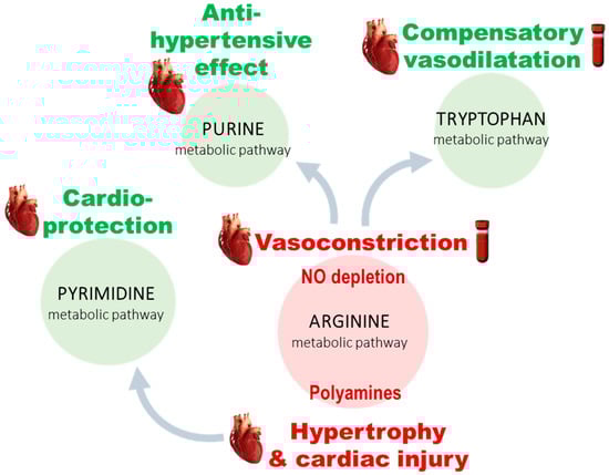 Arginine metabolism was the most impacted pathway in accordance with previous studies that described such alteration in plasma [12,15] and lungs of MCT-PH rats [25]. In the urea cycle, arginine can be metabolized competitively by nitrite oxide synthase (NOS) to produce nitric oxide (NO) or by arginase to synthesize ornithine and then polyamines (Figure 4(A1,B1)). This competitive metabolism of arginine regulates the NO/polyamines balance [27]. The role of polyamines in the physiopathology of PH is unclear. Indeed, while some studies linked spermidine and putrescine with an increase in RVS.P in CH-induced pulmonary vascular (PV) remodeling [31], others demonstrated their anti-inflammatory effects [32] and, therefore, their putative benefit against PH [33]. On the opposite, the critical role of NO for vasodilatation is well-referenced [34]. Numerous studies linked the progression of PH with NO alteration [35,36,37] and demonstrated that the urea cycle played a major role in PH severity [14,38]. Alteration of arginine metabolism leads to regulation of tryptophan metabolism as already described in the literature about PH [11,15]: Indeed, Lewis et al. reported that indoleamine 2,3-dioxygenase (IDO), the heme-containing enzyme metabolizing tryptophan into kynurenine, was over-activated by a decrease in NO as a compensatory vasodilator pathway [12,39] (Figure 4A3,B3). IDO-deficient mice developed exaggerated hypoxic pulmonary vasoconstriction [40]. Moreover, lung mRNA expression of IDO was increased in PH models, and IDO-tryptophan metabolites were correlated with RV dysfunction [12]. However, alteration of tryptophan metabolism has specifically been found altered in pulmonary circulation [12], explaining why kynurenate and xanthurenate were not altered in heart tissues in our study. Tryptophan can also be metabolized by tryptophan hydroxylase (TPH), which yields serotonin. Our results demonstrated alterations of serotonin in the plasma of CH-PH rats. Serotonin has been involved in the pathophysiology of PH, contributing to vasoconstriction and vascular remodeling in PH lungs [41,42]. In our study, a decrease in serotonin was observed in the plasma of the carotid artery, suggesting that tryptophan is mainly metabolized by IDO in our model.
