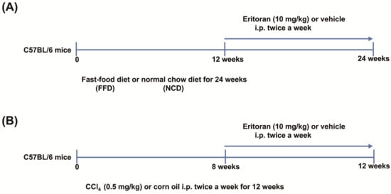 The mice were fed a fast-food diet (FFD, 20% fat, 49.9% carbohydrate, 17.8% protein, 2% cholesterol and 5% fiber (AIN-76 Western Diet, test diet)), glucose (18.9 g/L) and fructose (23.1 g/L) for 24 weeks to generate NASH and liver fibrosis [22]. Following 12 weeks of FFD or normal chow diet (NCD) feeding, the mice were randomly assigned to receive eritoran (Eisai, Inc., Andover, MA, USA) (10 mg/kg) [20] or the vehicle (saline, 100 μL) twice per week via intraperitoneal injection for 12 weeks with continuous FFD or NCD feeding (Figure 1A).