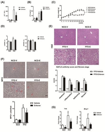 Compared to the NCD-fed mice, the FFD-fed mice exhibited an increase in the serum ALT and LPS levels (Figure 2A,B). Eritoran significantly decreased serum ALT levels (Figure 2A) without altering serum LPS levels (Figure 2B) in the FFD-fed mice. The kinetic body weight change, liver weight, spleen weight (Figure 2C,D) and intake of the FFD (FFD-V: 2.35 ± 0.05 g/mouse/day vs. FFD-E: 2.3 ± 0.19 g/mouse/day) did not differ between the FFD-V and FFD-E groups. H&E and myeloperoxidase (MPO) staining of the liver sections showed that eritoran treatment significantly reduced lobular inflammation and intrahepatic neutrophil infiltration in the FFD-fed mice (Figure 2E,F). The hepatic transcript levels of Tnfa and monocyte chemoattractant protein 1 (Mcp1) were decreased in the eritoran-treated FFD-fed mice (Figure 2G).