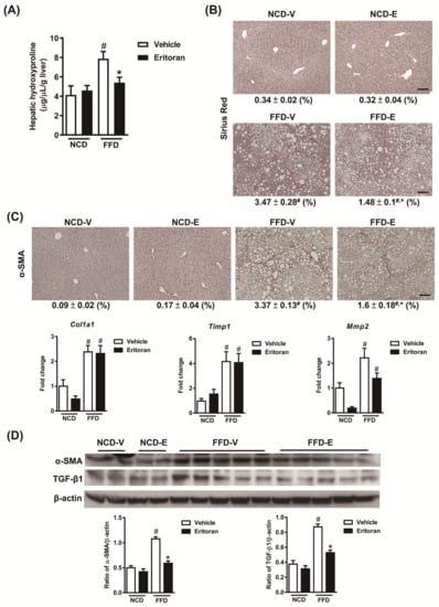In addition, eritoran attenuated liver fibrosis induced by the FFD as determined based on the hepatic hydroxyproline levels (Figure 3A) and the positive Sirius Red-stained areas (Figure 3B). A significant reduction in protein levels of the marker of HSC activation, alpha smooth muscle actin (α-SMA), and the profibrotic marker TGF-β1 was observed in the livers of the FFD-E mice (Figure 3C,D). There were no significant changes in the hepatic transcript expression levels of collagen type 1α1, tissue inhibitor of metalloproteinase 1 (Timp1) and matrix metalloproteinase 2 (Mmp2) (Figure 3C). These findings suggested that eritoran attenuated FFD-induced liver inflammation and fibrosis with suppression of HSC activation.