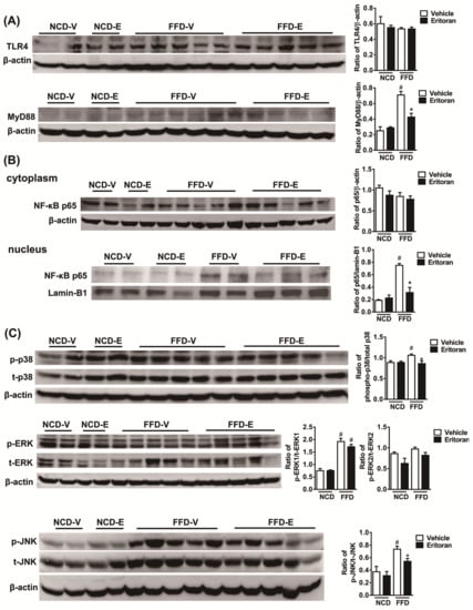 Eritoran suppressed the hepatic TLR4 downstream signaling pathway in the mice fed a fast-food diet. Western blot analysis and quantification of (A) TLR4 and myeloid differentiation factor 88 (MyD88); (B) cytoplasmic and nuclear NF-κB p65; (C) phosphorylated and total p38 (p/t-p38), extracellular signal-regulated kinase 1 and 2 (p/t-ERK1/2) and c-Jun N-terminal kinase (p/t-JNK) expression in the livers. NCD-V/NCD-E: the mice fed a normal chow diet (NCD) were injected with a vehicle (NCD-V, n = 6) or eritoran (NCD-E, n = 6); FFD-V/FFD-E: the mice fed a fast-food diet (FFD) were injected with a vehicle (FFD-V, n = 10) or eritoran (FFD-E, n = 9). Four samples from each of the NCV-V/NCD-E groups and 9–10 samples from the FFD-V/FFD-E groups were used for Western blot quantification; # p < 0.05 vs. NCD-V; * p < 0.05 vs. FFD-V.
