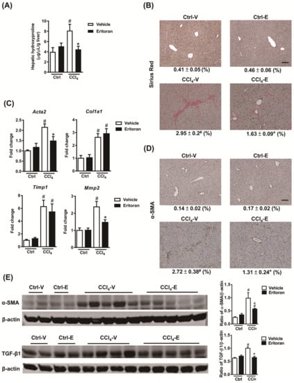 Eritoran attenuated liver fibrosis in the mice injured by CCl4. (A) Hepatic hydroxyproline levels. (B) Sirius Red staining of the liver sections and quantification of the positively stained areas (%). Scale bar = 100 μm. Tissue sections from all the mice were stained and quantified (means ± SEM). (C) Hepatic transcript levels of α-smooth muscle actin (Acta2), collagen 1α1 (Col1a1), tissue inhibitor of metalloproteinase 1 (Timp1) and matrix metalloproteinase 2 (Mmp2). (D) Immunohistochemical staining for α-SMA of the liver sections and quantification of the positively stained areas (%). Scale bar = 100 μm. Tissue sections from all the mice were stained and quantified (means ± SEM). (E) Western blotting of α-SMA and transforming growth factor-β1 (TGF-β1) in the livers. Ctrl-V/Ctrl-E: the mice that received corn oil (Ctrl) were treated with a vehicle (V) or eritoran (E); CCl4-V/CCl4-E: the CCl4-injured mice were treated with a vehicle (V) or eritoran (E); # p < 0.05 vs. Ctrl-V; * p < 0.05 vs. CCl4-V.