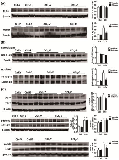 Eritoran suppressed the hepatic TLR4 signaling pathway in the mice treated with CCl4. Western blot analysis and quantification of (A) TLR4 and myeloid differentiation factor 88 (MyD88); (B) cytoplasmic and nuclear NF-κB p65; (C) phosphorylated and total p38 (p/t-p38), extracellular signal-regulated kinase 1 and 2 (p/t-ERK1/2) and c-Jun N-terminal kinase (p/t-JNK) expression in the livers. Ctrl-V/Ctrl-E: the mice that received corn oil (Ctrl) were treated with a vehicle (V) or eritoran (E); CCl4-V/CCl4-E: the CCl4-injured mice were treated with a vehicle (V) or eritoran (E). Four samples from each of the Ctrl-V/Ctrl-E groups and nine samples from the CCl4-V/CCl4-E groups were used for Western blot quantification; # p < 0.05 vs. Ctrl-V; * p < 0.05 vs. CCl4-V.