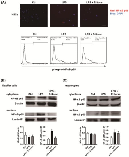 Eritoran suppressed the LPS-induced nuclear translocation of NF-κB p65 in primary hepatic stellate cells (HSCs) and Kupffer cells (KCs). (A) Immunofluorescence staining of primary mouse HSCs treated with the control medium (Ctrl), lipopolysaccharide (LPS, 100 ng/mL) or LPS (100 ng/mL) + eritoran (10 μg/mL) for 24 h. NF-κB p65, red; DAPI (diamidino-2-phenylindole) nuclear stain, blue. Scale bar = 50 μm. Flow cytometric analysis of the phosphorylated NF-κB p65 expression in primary HSCs. (B) Cytoplasmic and nuclear NF-κB p65 of primary KCs treated with the Ctrl, LPS (100 ng/mL) or LPS (100 ng/mL) + eritoran (10 μg/mL) for 24 h (n = 4/group). (C) Cytoplasmic and nuclear NF-κB p65 of primary hepatocytes treated with the Ctrl, LPS (1 μg/mL) or LPS (1 μg/mL) + eritoran (10 μg/mL) for 24 h (n = 4/group); # p < 0.05 vs. the Ctrl group; * p < 0.05 vs. the LPS group.