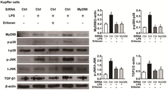 Eritoran decreased the MyD88-mediated p38/JNK phosphorylation in KC cells. Western blot analysis and quantification of myeloid differentiation factor 88 (MyD88), phosphorylated and total p38 (p/t-p38) and c-Jun N-terminal kinase (p/t-JNK) and transforming growth factor-β1 (TGF-β1) of primary KCs from the different treatment (n = 4/group). The isolated KCs were incubated with the siRNA control (Ctrl) (30 nM) or MyD88-siRNA (30 nM) for 48 h. After transfection, the cells were treated with or without LPS (10 ng/mL) or eritoran (10 μg/mL) for 6 h; # p < 0.05 vs. the group treated only with the siRNA control; * p < 0.05 vs. the group treated with the siRNA control and eritoran.