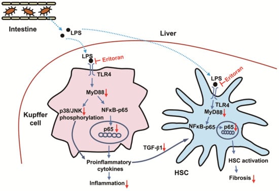 The proposed scheme of the regulation mechanism of eritoran in mice with chronic liver injury. The increased lipopolysaccharide (LPS) due to the increased gut permeability in the fast-food diet-fed or tetrachloride-injured mice [45,46] entered the liver and bound toll-like receptor 4 (TLR4) on the Kupffer cells or hepatic stellate cells (HSCs). In Kupffer cells, LPS activated myeloid differentiation factor 88 (MyD88), leading to the NF-κB p65 nuclear translocation and increased phosphorylation of p38 and c-Jun N-terminal kinase (JNK), which contributed to increased production of proinflammatory cytokines and inflammation. The secreted transforming growth factor-β1 (TGF-β1) from Kupffer cells could promote HSC activation. On the other hand, LPS binding to TLR4 of HSCs could also activate MyD88, leading to the NF-κB p65 nuclear translocation, which contributed to HSC activation and liver fibrosis [10,11,12,39]. Eritoran blocked the TLR4 signaling pathway by competing with LPS for binding sites on Kupffer cells and HSCs, leading to downregulation of the MyD88-dependent NF-κB and JNK/p38 pathways, which contributed to attenuation in hepatic inflammation and fibrosis. Blue arrow: upregulation; red arrow: downregulation.