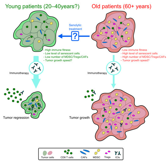 Predictive model of the immunotherapy efficacy in young and old patients. In old patients, we expected a loss of immunotherapy efficacy. Within the TME, the decrease in immune cell fitness with the enrichment of senescent cells and immunosuppressive cells (MDSC, Tregs, and CAFs) can be responsible for this resistance. Pretreatment with a senolytic drug could reverse this immunosuppressive context and enhance the immunotherapy efficacy in aged patients.