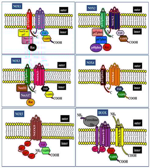 NOX enzymes are multi-subunit enzymes that transfer electrons across biological membranes and are essential for superoxide production. The prototypical NADPH oxidase NOX2, which catalyzes the NADPH-dependent reduction of oxygen to superoxide in phagocytes, was the first enzyme discovered [7]. The phagocytic NOX2 comprises six different subunits that interact to form an active enzyme complex. The catalytic gp91phox and p22phox subunits are located in the plasma membrane, and the regulatory (p47phox, p67phox, p40phox, and small G-protein Rac1/2) subunits are present in the cytosolic components and assembly of all NOX components responsible for the production of superoxide [8,9]. Under resting conditions, the multi-subunit enzyme is inactive. Upon stimulation, the entire cytosolic regulatory complex subsequently translocates to the plasma membrane and associates with catalytic subunits to form the active oxidase, generating superoxide by transferring an electron from NADPH in the cytosol to oxygen on the luminal space [10,11]. In parallel with the progress toward understanding the phagocytic NOX, a series of studies have identified six NOX2 homologs (NOX1, NOX3, NOX4, NOX5, DUOX (dual-oxidase) 1, and DUOX2) in mammalian systems [12,13,14,15]. There are indeed significant similarities and differences between the NOX homologs, for example, subunits that bind NOX1 are NOXO1 (NOX organizer 1) and NOXA1 (NOX activator 1) [16]. Notably, all members of the NOX family contain at least six transmembrane domains, and cytosolic FAD and NADPH-binding domains. However, NOX5 and DUOX1/2 contain extra functional domains that lack NOX1–4. NOX5 contains EF-hand Ca2+-binding domains, whereas DUXO1/2 has a seventh transmembrane domain at the NH2 terminus with an extracellular peroxidase-like domain in addition to the EF-hand and gp91phox homology domains [17,18] (Figure 1).