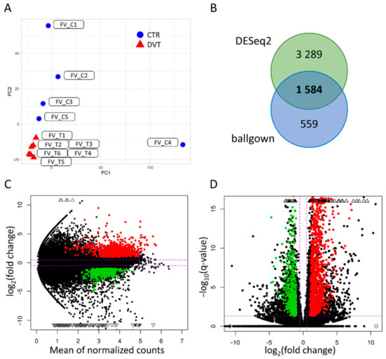 Expression profiles overview of DVT. (A) Graphical representation of the first (PC1) and second (PC2) principal components affecting the sample expression pattern of deep vein thrombosis (DVT; n = 6) and control (CTR; n = 5) libraries. (B) Venn diagram with the number of differentially expressed genes (DEGs) tagged by DESeq2 and ballgown methods. The middle number describes the consensus of DEGs distinguished by both methods. (C) MA chart with logarithmic values of fold change (logFC; Y axis) plotted against normalized counts (X axis) for DVT-affected and CTR libraries. Two horizontal dotted lines refer to the cut value of log2FC >1 and <−1. (D) Volcano plot depicts log2FC plotted against log-normalized p-values. The dotted horizontal line indicates negative logarithmic adjusted p-value (0.05) cut-off. Dotted vertical lines indicate cut-off values of logFC. (C,D) Red dots illustrate upregulated differentially expressed genes (DEGs); green dots represent downregulated DEGs; black dots are not significant transcripts, according to DESeq2 and ballgown methods.
