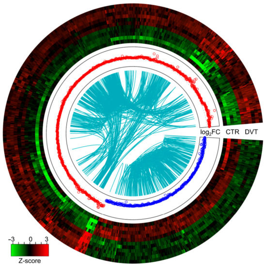 Circular heatmap visualization of differentially expressed genes (DEGs) in the incidence of the DVT. The 11 upper tracks visualize the normalized (Z-score; red-green scale) expression profiles for DEGs in each biological replicate (DVT—deep vein thrombosis and CTR—control libraries). The middle track describes increased (red) and decreased (blue) expression (logFC) in the compared groups. The most-inner track shows the correlation links between the co-expressed DEGs, whereas blue links depict positive Euclidean correlation > 0.9.