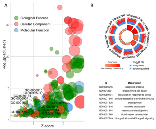Enrichment ontology visualization. (A) GOBubble chart of the ontology terms (biological process—BP, cellular components—CC and metabolic function—MF) detected during Gene Ontology (GO). Circle size is proportional to the logarithmic scale of adjusted p-value in enrichment GO analysis. Z-score is calculated from the number of up- and downregulated genes enriched in each GO term. (B) Circos visualization of 10 selected BP processes related to DVT. Red dots illustrate upregulated differentially expressed genes (DEGs); blue dots represent downregulated DEGs; black dots are not significant transcripts.