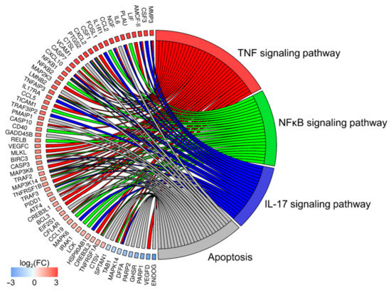 Circos plot represents four significantly enriched Kyoto Encyclopedia of Genes and Genomes (KEGG) pathways associated with differentially expressed genes (DEGs) engaged in deep vein thrombosis (DVT). Gene symbols with logarithmic values (blue-red scale) of fold change (logFC) are located on the left side of circos. Four color links merge genes with KEGG annotations (TNF, NF-κB, IL-17 and apoptosis signaling pathways) on the right side.