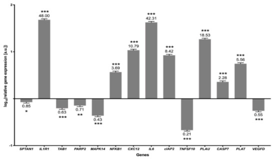 The mRNA expression of selected genes obtained from Real-Time PCR. The values (above and beneath the bars) indicate the changes relative to the normalized expression value of the reference gene ACTB. Arbitrary unit value is set as 1 [a.u.]. Genes with expression value <1 were downregulated and >1 were upregulated. All the relative expression values were presented in logarithmic scale (log10). p-values are considered statistically significant at <0.05 (*), <0.01 (**) and <0.0002 (***).
