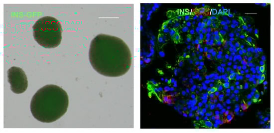 The destruction of insulin-producing β-cells is the main pathophysiological feature of type 1 diabetes (T1D) [1,2]. Blood glucose levels can be reduced by daily multiple exogenous insulin injections or continuous insulin infusion via a pump. However, because the exogenous insulin does not pass through the liver, the insulin is unable to regulate hepatic glucose levels, resulting in unstable glycaemic control in T1D patients [3]. Insufficient glycaemic control induces long-term complications in T1D patients. Sensor augmented insulin-pump therapy and transplantation therapy of whole pancreas or pancreatic islets may be useful strategies to compensate for β-cell function and control the blood glucose levels [4]. Although pancreas transplantation provides a high rate of normalization of the blood glucose levels and insulin withdrawal, it requires a technically difficult surgery and can have several postoperative complications, including portal vein thrombosis [5]. Pancreas transplantation also improves the quality of life; however, the number of donors is limited, and immunosuppression therapy is required [6]. Reportedly, patients with T1D were able to withdraw from insulin therapy after undergoing islet transplantation from brain-dead donors accompanied by steroid-free immunosuppressive therapy [7]. Islet transplantation reportedly reduced hypoglycaemic events and improved glycaemic control in T1D patients, compared with insulin injection therapy [8]. Islet transplantation has a lower risk of surgical complications than pancreas transplantation, but repeated transplantations are often required to enable withdrawal from insulin therapy [9]. Thus, the transplantation of both pancreas and islets has problems associated with donor shortage, immunosuppressive therapy, and graft rejection. As a method that can cope with the shortage of donors, a therapeutic strategy for producing pancreatic islet-like cells from human pluripotent stem cells (hPSCs) including induced pluripotent stem cells (iPSCs) or embryonic stem cells (ESCs) and applying them to transplantation can be considered. In the past 15 years, basic methods for inducing the differentiation of human stem cells towards pancreatic endocrine cells, generated from the formation of definitive endoderm to pancreatic endoderm during embryogenesis, followed by differentiation into pancreatic progenitors have been established, enabling a yield of 20–40% insulin+ pancreatic islet-like cells [10,11,12,13,14,15]. Because islet cells have a three-dimensional (3D) structure and interact with surrounding cells in vivo, “co-culture” models, such as the co-culture of islet cells and endothelial cells, should be considered [16,17,18]. In vitro, several methods have been used to generate engineered pancreatic islets with a 3D structure, known as “pseudo-islets”, which are composed of α, β, δ, PP and ε cells [19,20]. Micallef et al. generated a human embryonic stem cell reporter that encodes green fluorescent protein (GFP) at the INS locus to facilitate the characterization of insulin-producing cells [21]. Figure 1 shows the images of human pluripotent stem cells (hPSCs)-derived islet organoids. The transplantation of stem cell-derived pseudo-islets has the potential to improve insulin secretion in diabetic rodents [22]. However, how the immune response and the changes in β-cell function progress when stem cell-derived islet cells are transplanted remain largely unclear. Moreover, the cost-effectiveness of stem cell therapy for β-cells or pseudo-islets, compared with conventional diabetes therapy, must also be considered.