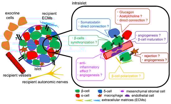 Schema of islet microenvironment. The interactions of β-cells with α-cells, δ-cells, endothelial cells, mesenchymal stromal cells, macrophages, and ECMs can affect β-cell function and survival. The differences in the interactions with microenvironments between transplanted hPSCs-derived islets and transplanted human islets remain unclear.
