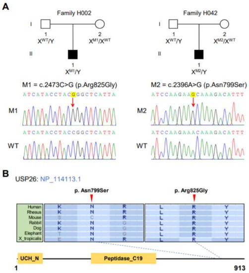 In this study, whole-exome sequencing analyses were performed on the cohort of 150 subjects affected by asthenoteratozoospermia, according to a previously described protocol [21]. After applying stringent bioinformatic analyses, we identified two men harboring hemizygous missense variants in USP26 (MIM: 300309): c.2473C>G (p. Arg825Gly) in subject H002 II-1 and c.2396A>G (p. Asn799Ser) in subject H042 II-1 (Figure 1A). Subsequent Sanger sequencing revealed that these hemizygous USP26 variants were inherited from their heterozygous maternal carriers (Figure 1A). Both of the hemizygous variants in USP26 are absent or extremely rare in human genome datasets, and have been predicted to be damaging through the use of the PolyPhen-2, SIFT, M-CAP, and CADD tools (Table 1).