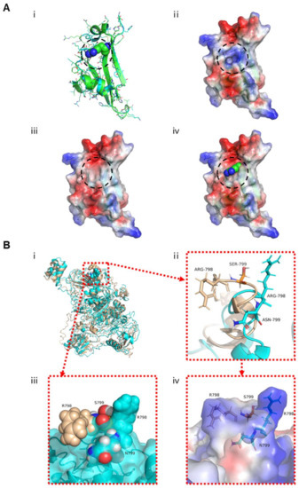 Effects of USP26 missense mutations on the structure of the USP26 protein. (A) The structure comparison of wild-type USP26 and the mutant Arg825Gly. (i) Structure comparison in cartoon images (Arg825 in spheres, wild-type in cyan, and mutant in green); (ii) MEP (molecular electrostatic potential) of the wild-type USP26 structure, (iii) MEP of the mutant Arg825Gly structure; (iv) Arg825 superposition on the MEP of the mutant Arg825Gly. The mutants in the surface area are highlighted with dashed circles. (B) The structure comparison and close-up view of the mutant Asn799Ser. (i) Superposition and comparison of wild-type USP26’s (in cyan) whole structure and its mutant Asn799Ser (in wheat). According to the close-up view of the helix-loop-helix (HLH) structure (ii), the surface comparison (iii), and the MEP comparison (iv) of the two structures, Asn799 is located in an HLH structure motif and exposed at the surface of loop; thus, its mutant Asn799Ser tends to induce the HLH conformation change. The side chain of its neighbor residue, Arg798, has a large reorientation, which may lead to a significant surface change, as well as the electrostatic map difference.