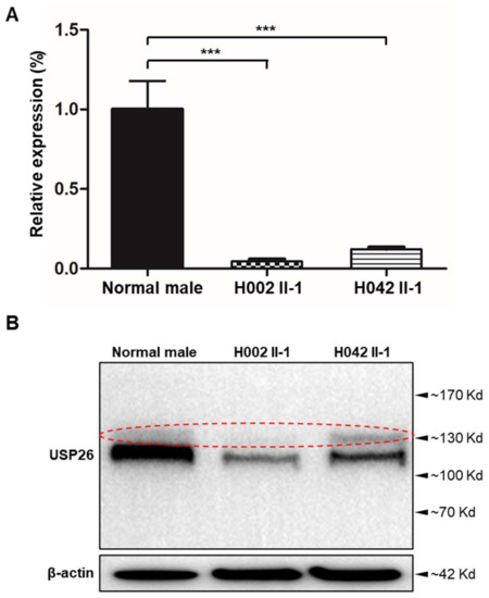 Expression analysis of USP26 mRNA and USP26 in the spermatozoa from a normal male control and men harboring hemizygous USP26 variants. (A) Real-time quantitative PCR analysis indicated that the abundance of USP26 mRNA was significantly reduced in the sperm from men harboring hemizygous USP26 variants, when compared to that of a normal control man. Data represent the means ± standard error of measurement of three independent experiments. Two-tailed Student’s paired or unpaired t-tests were used as appropriate (*** p < 0.001). (B) Immunoblotting assay indicated dramatically reduced expression of USP26 in the spermatozoa from men harboring hemizygous USP26 variants. β-actin was used as a loading control. The red circle represents non-specific bands.