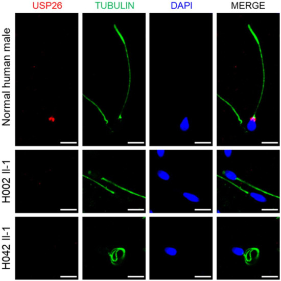 Immunofluorescence staining of USP26 in the spermatozoa from a normal male control and men harboring hemizygous USP26 variants. The sperm cells were stained with anti-USP26 (red) and anti-a-tubulin (green) antibodies. DNA was counterstained with DAPI (4′,6-diamidino-2-phenylindole) as a marker of the cell nucleus. Scale bars: 5 mm.
