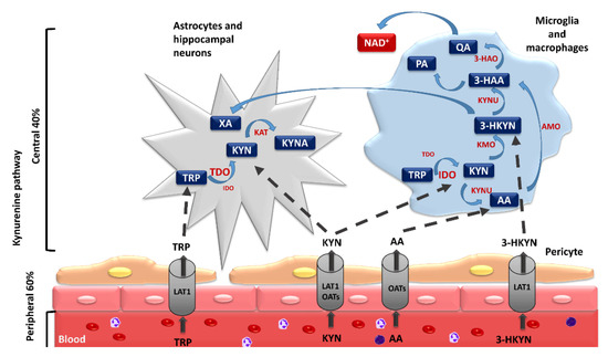 | Tryptophan 2,3-dioxygenase (TDO, EC 1.13.11.11) | - Is necessary to maintain proper NAD+ intracellular level | - Can increase inflammation-associated oxidative stress level, leading to increase in depression, anxiety-related behavior, AD, and HD symptoms severity | [11,68,151,163,199,200] |