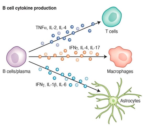 A major B cell effector mechanism is the selective release of a spectrum of cytokines. Naïve B cells do not secrete extensive cytokines after activation and require additional inducers from the immune microenvironment to enhance their cytokine production. The outcomes of B cell signaling such as the induction of Th1/Th2 cells depends in part on environmental cues. For example, B cell receptor signaling induces B cell proliferation and production of pro-inflammatory cytokines, such as TNFα and IL-6 [,,]. Although cytokine production is relatively widespread, their selective secretion from B cells is vital for multiple aspects of immune health. For example, naïve B cells produce cytokines that bind to CD4+ T cells and influence their subsequent functionality. Bacterial and viral infections can stimulate B cell production of tumor necrosis factor (TNF) and interferon gamma (IFNγ) that subsequently promote the differentiation of T cells towards a Th1 path, inducing macrophage activation and proliferation that results in the production of more cytokines that increase the immune response under certain conditions []. Similarly, mice lacking B cells can develop a dysfunctional Th1 response during infection []. Not only are B cell-derived cytokines important for the generation of specific immune responses, they are also essential for the generation of secondary and tertiary lymphoid organs [] and an example of such a cytokine is lymphotoxin (LT). The targets of these cytokines are not limited to the immune system, and LT was recently shown to influence CNS neural stem cell fate by promoting glial cell differentiation and suppressing neurogenesis through LTβR signaling. Moreover, in the CNS, it is well known that microglia and astrocytes represent the main responders to inflammatory stimuli, including cytokines, such as IFNγ, IL-4, IL-17, and IL-6 [,,,,], emphasizing the critical interplay of the adaptive immune system and the CNS [] (Figure 1).