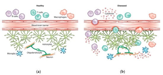 - Voskuhl, R.R.; Peterson, R.S.; Song, B.; Ao, Y.; Morales, L.B.J.; Tiwari-Woodruff, S.; Sofroniew, M.V. Reactive Astrocytes Form Scar-Like Perivascular Barriers to Leukocytes during Adaptive Immune Inflammation of the CNS. J. Neurosci. 2009, 29, 11511–11522. [Google Scholar] [CrossRef] [PubMed]