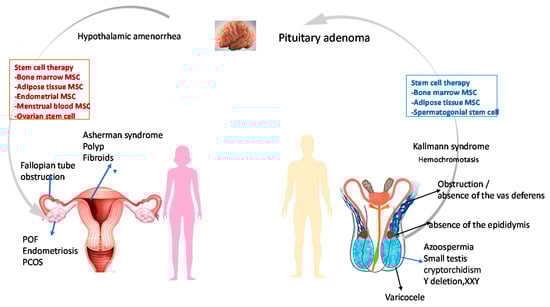 Fertility is the ability to achieve clinical pregnancy. According to the international glossary, infertility is defined as “A disease characterized by the failure to establish a clinical pregnancy after 12 months of regular, unprotected sexual intercourse or due to an impairment of a person’s capacity to reproduce either as an individual or with his/her partner.” Fertility interventions may be initiated in less than 1 year based on medical, sexual, and reproductive history, age, physical evaluation, and diagnostic testing. Infertility is a disease, which generates disability as an “impairment of function” [1]. While the term infertility delineates a condition of a restricted time period, sterility illustrates a permanent state of infertility [1]. Infertility has emerged as a global health issue [2] that may arise from factors related to male or female or both. Approximately 12–15% of reproductive-age couples, representing more than 48 million couples and approximately 72 million people, are affected by infertility worldwide [3], of which approximately 30% are exclusively contributed by male factors [4], and approximately 30% are from the combination of both partners. According to Single Care’s infertility survey, the cause of 8–28% of infertility cases remains unexplained (https://www.singlecare.com/blog/news/infertility-statistics/accessed on 30 March 2021). In developing countries, 1 in 4 couples suffers from infertility (WHO 2004). According to a CDC (2013) report and Office on Women’s Health (2019) (https://www.womenshealth.gov/a-z-topics/infertility/accessed on 30 March 2021), in the United States, approximately 9% of men and 10% of women of reproductive age experience infertility [5]. According to the Central Intelligence Agency (2017), Africa contributes to the highest brunt of infertility cases, followed by Afghanistan. On the other hand, according to the United Nations Population Fund (2018), Southern Europe and Eastern Asia have the lowest fertility rates, at 1.5 children per woman on average [6]. This statistical information emphasizes that a substantial number of couples worldwide are having trouble with conception. Hence, many couples are deprived of having genetically related offspring. Conventional treatment, including ovulation-inducing drugs, or assisted reproduction technology (ART) could resolve these issues to a certain extent. However, these existing treatments enhance the risks of multiple pregnancies or lack efficacy in some couples, both of which create a financial burden to the couple. To overcome the shortcomings of the current treatment methods and considering the ability of stem cells to replenish damaged tissues via their self-renewal properties and ability to differentiate into multiple lineages, stem cells could be considered as a novel therapeutic measure for infertility [7,8]. Extensive preclinical and clinical trials are in the pipeline to investigate the safety and efficacy of stem cells as another promising therapeutic approach for the restoration of fertility [9].