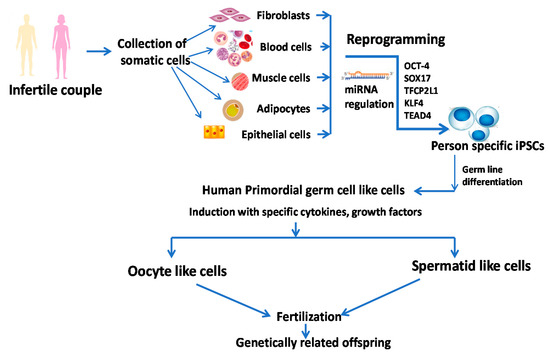 Yamashiro et al. [57] and Gell and Clark [58] reported the feasibility of differentiation of iPSCs into oogonia giving hope to couples with poor ovarian reserve or inability to develop functional eggs. In their studies, at first, they differentiated somatic cells into iPSC by reprogramming and then generated incipient mesoderm-like cells (iMeLCs) in the presence of Activin A and Chiron. This was followed by the generation of human primordial germ cell-like cells (hPGCLCs) by plating iMeLCs in aggregates. These hPGCLCs were mixed with gonadal cells isolated from female mouse embryonic ovaries and cultured for 4 months to obtain oogonia by in vitro gametogenesis. This technique will bring a revolution in reproductive medicine through the generation of oogonia from human pluripotent stem cells. Sugawa et al. [59], on the other hand, documented the mechanistic explanation of differentiation of human pluripotent stem cells to heterogeneous mesoderm-like cells in the presence of cytokines followed by the generation of PGC-like cells (PGCLCs), and the PGCLCs are committed to developing gametes (sperm or eggs) that were associated with a unique expression of PRDM14 [59]. Generation and proposed therapeutic implications of iPSCs in infertility are presented in Figure 2. Sources: [35,57,60].