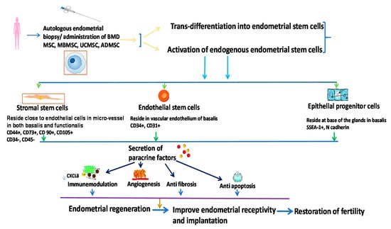 Following the initial introduction of endometrial stem cells by Prianishnikov and his colleagues in 1978 [84], Chan and his colleagues in 2004 [85] isolated stem cells from endometrial tissues and identified the colonization properties of these cells in vitro. Later, Gargett and coworkers [86] isolated and cultured MSCs from human endometrium based on their expressed markers and speculated on their contributions in endometriosis and endometrial cancer [86]. The EndSC microenvironment is comprised of stromal cells, epithelial progenitor cells and endothelial cells. Stromal cells were isolated by the presence of CD44, CD73, CD90, and the absence of CD34 and CD45 phenotypes, while epithelial progenitor cells demonstrated the presence of stage-specific embryonic antigen (SSEA-1), N-cadherin, and NTDPase2 activity. However, endothelial stem cells documented the presence of a classical phenotype such as CD 31 and CD 34 [9]. In the absence of any injury, these stem cells were present in quiescent undifferentiated form within the endometrium. However, in the presence of inflammation or damage to the endometrium, these stem cells were directed to the injured site following interaction between chemokines and CXCR4, which is expressed on stem cells, and CXCL12, which is expressed by the epithelium of endometrial tissues [87]. Endometrial stem cells act as the origin of cells that help in replenishing the endometrium, such as mesenchymal stem cells (MSCs), epithelial stem cells, endometrial side population cells (ESP), and endometrial regenerative cells (ERC) [88]. ESPs constitute only 5% of EndSCs and are primarily present in the proliferative phase of the menstrual cycle [89]. ERCs such as MSCs can undergo differentiation into multiple tissues such as adipose tissue, neuronal tissue, bones, and cartilage [90]. They can induce immune regulation, angiogenesis as well as the release of matrix metalloproteinases more efficiently compared to MSCs. Appropriate blood circulation in the uterus is required for the maintenance of different stages of reproduction, including the development of the endometrium [91]. It was observed that inadequate neovascularization probably due to the impaired release of vascular endothelial growth factor resulted in thinning of endometrium in an animal transplantation model [92]. Hence, this angiogenic property of endometrial stem cells could be implicated in the therapeutic transplantation of reproductive medicine for endometrial regeneration. Endometrial stem cells can also be derived from menstrual blood.