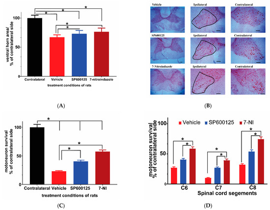 Ventral horn area and motor neuron survival in C6, 7, and 8 cervical segments 6 months after avulsion. (A) Comparison of ventral horn size (area) 6 months after avulsion between the control and SP600125 or 7-nitroindazole (7-NI) treatment groups (n = 4/group). The sizes of the corresponding ipsilateral/contralateral areas were computed by planimetry. There was significant atrophy of ipsilateral ventral horns of vehicle, 7-nitroindazole, and SP600125-treated rats. Data expressed as mean ± SD, as a percentage of values determined in the corresponding contralateral side. Comparisons by one-way ANOVA followed by Tukey’s honestly significant difference (HSD) whereby * p < 0.05, n = 4 rats. (B) Neutral red-stained right ipsilateral and left contralateral ventral horns of the cervical spinal cord showing motor neurons (black outline) as seen under the light microscope (40× magnification) (scale bar, 100 µm). The representative images of the left and right ventral horns of each of the groups: vehicle, SP600125, and 7-nitroindazole are shown. (C) Survival of motor neurons (expressed as the mean percentage of the contralateral side 6 months after avulsion) in control and the neuroprotective agent (7-nitroindazole and SP600125) treated rats. Data reported as mean ± SD, as a percentage of values determined in the corresponding contralateral side. * p < 0.05, n = 4 rats; Tukey’s HSD * p < 0.05). (D) Motor neuron survival in C6, 7, and 8 cervical segments 6 months after avulsion. The magnitude of motor neuron loss was greatest in the vehicle-treated rats compared to groups that received neuroprotective treatments. Generally, the 7th cervical segment had the least number of surviving motor neurons across all groups. Data expressed as mean ± SD, as a percentage of values determined in the corresponding contralateral side. * p < 0.05, n = 4 rats.