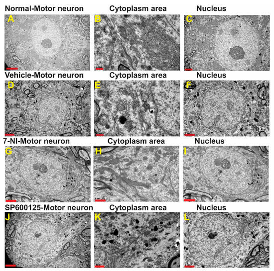 Ultrastructure of representative α-motor neurons. A–C: A—Ultrastructure of representative normal α-motor neuron from the contralateral side showing organelles (B) and nucleus (C). 1 µm and 2 µm; D–F: D—Ultrastructure of representative α-motor neuron from the ipsilateral side of a vehicle-treated rat showing organelles in cytoplasm (E) and nucleus (F). Scale bars = 0.5 µm and 2 µm; G–I: Ultrastructure of repesentative α-motor neuron from theipsilateral side showing 7-nitroindazole showing organelles in cytoplasm (H)—Ultrastructure of representative α-motor neuron from the ipsilateral side of a 7-nitroindazole-treated rat showing organelles (H) and nucleus (I). Scale bar = 1 µm and 2 µm; J–L:J—Ultrastructure of representative α-motor neuron from the ipsilateral side of as SP300125-treated rat showing organelles (K) and nucleus (L). Scale bar = 1 µm and 2 µm.