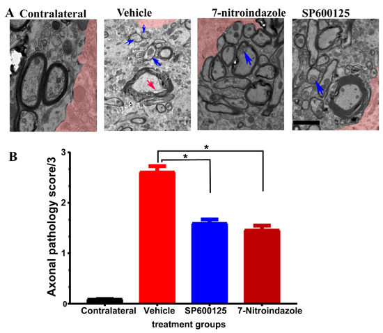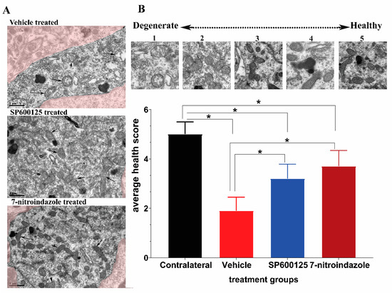Representative transmission electron microscopy (TEM) images showing mitochondrial morphology. (A) shows the mitochondria of motor neurons treated with vehicle, SP600125, and 7-nitroindazole. (B) top part shows a health scale of 1 to 5, whereby 5 represents mitochondria of healthiest possible appearance (distinct and well-packed cristae, electron-dense, completely intact inner and outer membranes) while 1 is degenerate. Magnification 13,500×. Scale bar = 1 µm. Differences between contralateral side and vehicle or 7-nitroindazole and SP600125-treated rats were significant at * being p < 0.05 using one-way ANOVA followed by Tukey’s HSD.