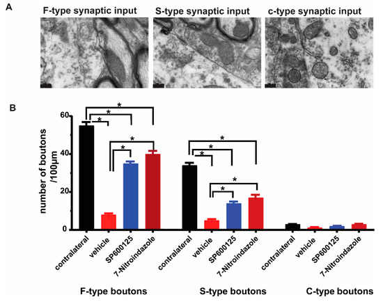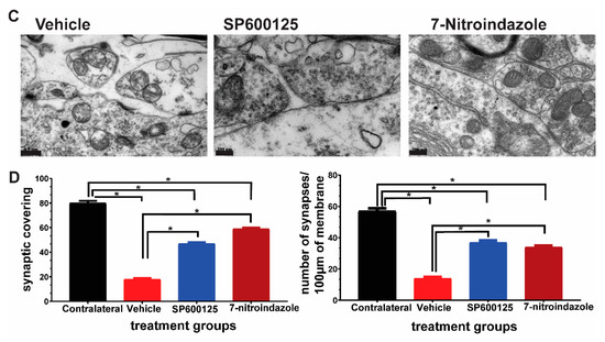 Large neurons, approximately 35 μm wide, with a nuclear plane showing and C-type nerve terminals visible were designated alpha motor neurons [28]. The cell surfaces were inspected for completeness and then its perimeter captured at a magnification of 18,500× using a digital camera attached to the Tecnai™ Spirit transmission electron microscope (Fei, Japan). The perimeter of the complete neurons was measured and the number of synaptic terminals apposing the motor neuron somata was recorded per every 100 μm of the cell membrane by assistants blinded to the treatment conditions. Three types of synaptic input terminal were recognized under high magnification (at least 25,000×) according to the [29] nomenclature: F-type (flattened synaptic vesicles and are inhibitory), S-type (spherical synaptic vesicles and are excitatory inputs), or C (cholinergic inputs). In total, five neurons per rat in each group were examined (n = 20 neurons per group: 7-nitroindazole, SP600125, and vehicle control rat. The visual contrast between some structures on the same electron micrograph was digitally colored with the Adobe Photoshop software to make them more visible.