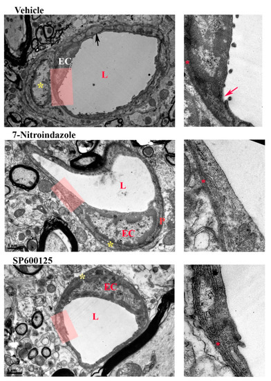 Neurovascular unit. Electron microscopy showing representative spinal cord microvessels in the left C7 ventral horn of rats injected with either vehicle, JNK inhibitor SP600125, or 7-nitroindazole. Magnification 9700× and 18,500×. Scale bar: 1 µm. L = lumen, EC = endothelial cell. Red arrow- disruption of endothelial membrane. Red star (*) = basement membrane. Yellow star * = pericyte.