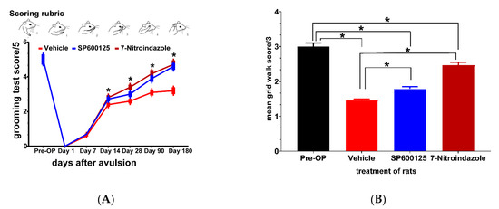 Results of the Terzis grooming test showed that rats in the neuroprotective treatment groups (7-nitroindazole and SP600125) scored progressively better from the second week up to 6 months compared to those in vehicle control (Figure 8A). Qualitatively, however, the improved movements in the neuroprotective agent-treated groups were largely because of gross motor movements of the proximal forelimb muscles. There was no significant difference between 7-nitroindazole and SP600125-treated rats’ grooming abilities (p > 0.05)