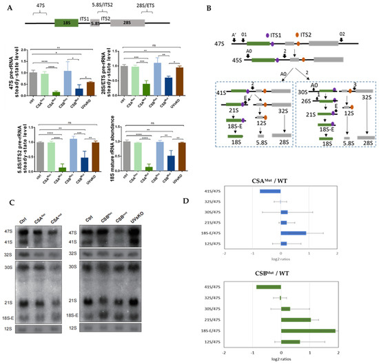 Deficient RNA Pol I transcription and altered rRNA processing in CS cells. (A) Quantitative PCR analysis of 47S, 28S/ETS, 5.8S/ITS2, and mature 18S rRNA. Used cell lines were wt (1306 fibroblasts), CSArec (CS3BE transfected with HA-CSA), CSAmut (CS3BE), CSBrec (CS1AN, transfected with HA-CSB), CSBmut (CS1AN), and UVsKO (UV-sensitive cells). A scheme of the primer positions is provided above. (B) Schema of the rRNA processing pathway in human cells, adapted from Mullineux and Lafontaine [25]. The ITS1 probe is identified in purple; the ITS2 probe is in orange. (C) Northern blot image of control cells, CS mutated cells, and reconstituted cells. (D) RAMP analysis of the Northern blots reveals a relative accumulation of processing intermediates in CS patient cells. Quantification and statistics are provided in the Supplementary Material (Figure S1). Asteriks (*) in the figures represent ρ values (* p < 0.05, ** p < 0.01, *** p < 0.001, **** p < 0.0001).