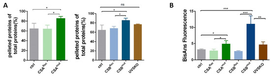 Previously, employing the identical cell lines as used here, Alupei et al. showed that the fidelity of the translation process is reduced in CS cells [10]. CS ribosomes produce misfolded proteins that are prone to oxidation. In an attempt to further characterize the proteome of CS cells, we investigated the stability of the proteome against heat denaturation. Cytoplasmic extracts were centrifuged to remove insoluble proteins, and the supernatant was subjected to a short heat treatment of 99 °C for 15 min. Subsequent centrifugation separated the heat-denatured fraction from the heat-stable fractionthat was quantified by Bradford measurement. As presented in Figure 3A, the CSA and CSB mutations were associated with a nearly 20% increase in heat-denaturable proteins, supporting and extending previous data [10]. Moreover, this increase in the heat sensitivity of the proteome may imply that errors in the translation process in CS also affect a higher proportion of total cytoplasmic proteins that are misfolded and prone to heat stress. To investigate whether this increase in misfolded proteins also affects the ribosome, we analyzed ribosomes for their unfolding stability. Unfolding stability against heat and urea characterizes long-living species [14]. When challenging ribosomal proteins with urea with subsequent quantification of the amount of unfolding by BisAns incorporation (Figure 3B), we found a profound increase in exposed and labeled hydrophobic side chains. These data highlight that ribosomal proteins of CS cells are highly susceptible to urea-induced unfolding, which is indicative of misfolded proteins in the isolated ribosomes of CS cells. Therefore, the proteome and the ribosomal proteins themselves are characterized by the accumulation of instable variants.