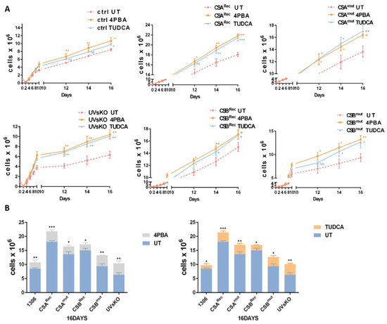 Chemical chaperones increase cell growth. (A) Proliferation kinetics of all cell lines in standard media (untreated, UT), 4PBA (1 mM) media, or TUDCA (200 μM) media. Cells were counted every second day and continued over a time period of 16 days. (B) Cell number of all cell lines cultured in normal media compared to that in 4PBA media (left) and in TUDCA media (right) after 16 days. Asteriks (*) in the figures represent ρ values (ns, p > 0.05, * p < 0.05, ** p < 0.01, *** p < 0.001).