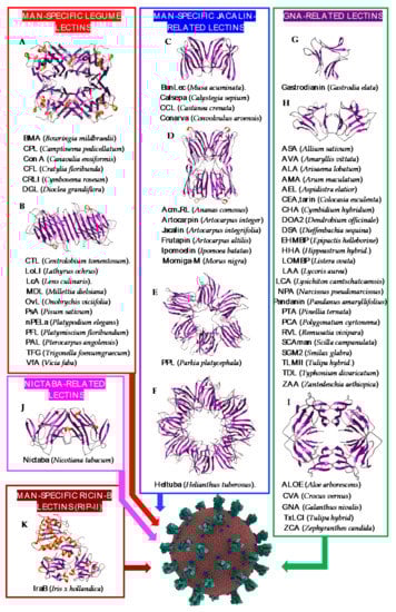Overview of lectins from representative genera/species belonging to higher plant families, with their associated structural scaffolds, able to recognize the spike proteins from coronaviruses (Coronavirus Credit: Maria Voigt/RCSB PDB). A-K correspond to lectins used as structural scaffolds ((A): Con A, (B): LcA, (C): BanLec, (D): Morniga-M, (E): PPL, (F): Heltuba, (G): Gastrodianin, (H): ASA, (I): GNA, (J): Nictaba, (K): IraB. References [,,,,,,,,,,,,,,,,,,,,,,,,,,,,,,,,,,,,,,,,,,,,,,,,,,,,,,,,,] correspond to the lectins presented in the figure.