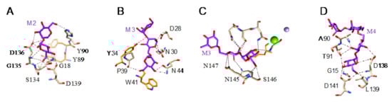 All of these lectins readily interact with Man and oligomannosides but, more interestingly, they display a higher affinity for more complex Man-containing glycan chains that are usually associated with cell surfaces. In this respect, different Man-specific lectins have been co-crystallized in the presence of Man (Figure 3A–C), di-mannoside (Figure 4A), tri-mannoside core Manα1,3Manα1,6Man (Figure 4B,C), and tetra-mannoside (Figure 4D) occurring in N-glycans of the complex and high-mannose type.