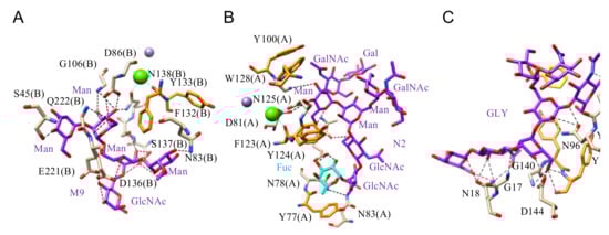 In addition, results from glycan arrays and binding assays, and X-ray crystallography of lectins co-crystallized in the presence of complex glycan chains revealed that Man-binding lectins from higher plants also accommodate more complex N-glycan chains, through a complex network of hydrogen bonds and stacking interactions between the pyranose ring of sugars and aromatic residues (F, W, Y) located in the vicinity of the CBS of lectins (Figure 5A–C).