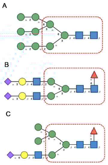 (A). High-mannose N-glycan, in which only Man (green circles) residues extend the core. (B). Complex N-glycans with two antennae initiated by a GlcNAc residue (blue square) extending the core. (C). Hybrid N-glycan with Man extending the Man1,6 arm of the core and GlcNAc extending the Man1,3 arm of the core. The core is delineated by a dashed red line.