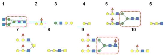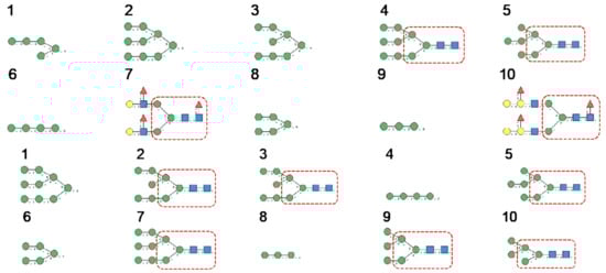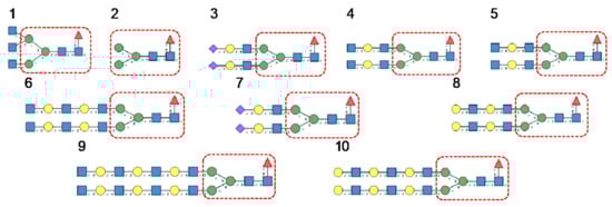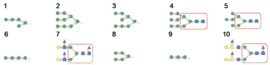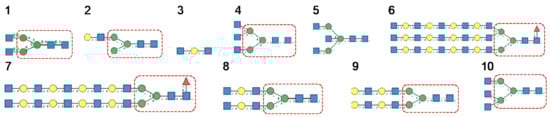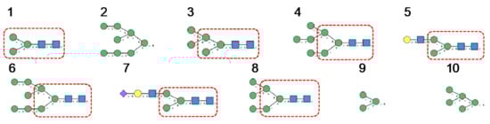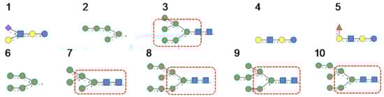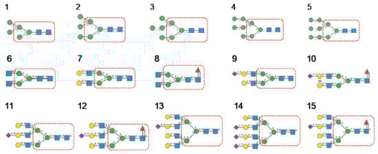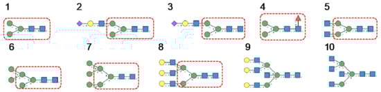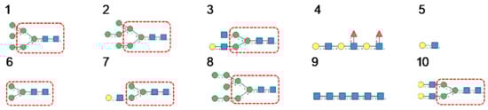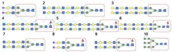 N-glycans are classified into three types, including oligomannose or high-mannose glycans, complex glycans, and hybrid glycans, according to the extensions of their common core sequence Manα1,3(Manα1,6)Manβ1,4GlcNAcβ1,4GlcNAcβ1-Asn (Figure 6A–C):