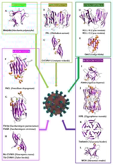 Overview of lectins from the major representative genera/species of lower plants and fungi, with their associated structural scaffolds, able to recognize the spike proteins from coronaviruses (Coronavirus Credit: Maria Voigt/RCSB PDB). A-L correspond to lectins used as structural scaffolds (A): Marpola, (B): PAL, (C): CrCVNH, (D): RCLL-N, (E): Gnk2, (F): PeCL, (G): Flo1p, (H): TbCVNH, (I): Abmb, (J): HRL, (K): Tectonin 2, (L): MOA. References [,,,,,,,,,,,,] correspond to the lectins presented in the figure.