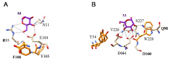 (A). Network of hydrogen bonds (black dashed lines) anchoring Man (M) to the amino acid residues N11, R93, and E104, forming the CBS of ginkbilobin from Ginkgo biloba (PDB code 4XRE). Aromatic residue Y103 and F108 participating in weak stacking interactions with the pyranose ring of Man are colored orange. (B). Network of hydrogen bonds (black dashed lines) anchoring Man (M) to the amino acid residues Q98, D160, D161, V226, and S227, forming the CBS of flocculin Flo5 from Saccharomyces cerevisiae (PDB code 2XJP). Aromatic residues Y54 and W228 involved in stacking interactions with the pyranose ring of Man are colored orange.