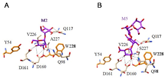(A). Network of hydrogen bonds (black dashed lines) anchoring Mannobiose (M2) to the amino acid residues forming the CBS of flocculin Flo5 from Saccharomyces cerevisiae (PDB code 2XJU). Aromatic residue Y54 and FW228 participating in stacking interactions with the pyranose ring of the first Man residue are colored orange. (B). Network of hydrogen bonds (black dashed lines) anchoring Mannopentaose (M5) to the amino acid residues forming the CBS of flocculin Flo5 from Saccharomyces cerevisiae (PDB code 2XJT). Aromatic residue Y54 and W228 involved in stacking interactions with the pyranose ring of the first Man of the oligomannoside are colored orange.